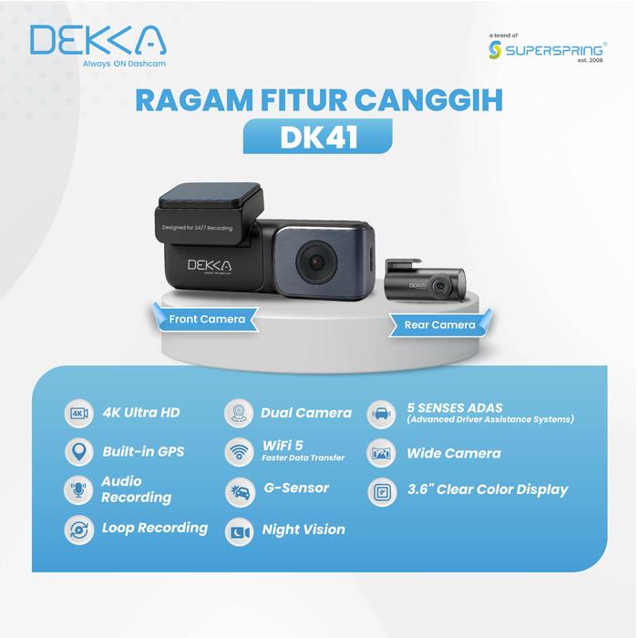Dashcam DEKKA DK41 adalah kamera mobil premium dengan kualitas 4K UHD yang mampu merekam setiap detail perjalanan Anda dengan tajam dan jernih. Dilengkapi dual camera depan dan belakang 1080p, dashcam ini memberikan perlindungan maksimal dari dua arah.Dengan layar sentuh 3.6 inci, kontrol menjadi lebih mudah, ditambah dukungan WiFi 5GHz dan App Control yang memungkinkan akses rekaman langsung dari smartphone. Teknologi Night Vision, G-Sensor, serta GPS Tracking memastikan keamanan tetap terjaga siang maupun malam.