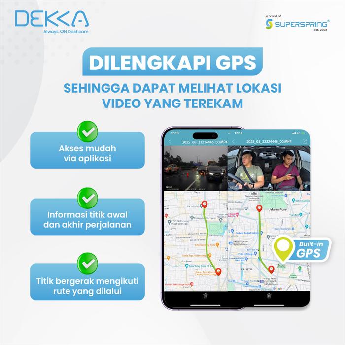 Gak perlu ribet atau nunggu lama. Akses seluruh hasil rekaman Always On Dashcam DEKKA bisa langsung dari aplikasi.Bakal berguna banget misal butuh bukti kejadian penting dan harus menyertakan lokasi kejadian. Jadi gak hanya hasil rekaman yang super jernih, tapi juga informasi yang super detail bisa kamu dapetin kalau pasang Always On Dashcam DEKKA Upgrade dashcam kamu dengan dashcam dari DEKKA!